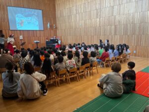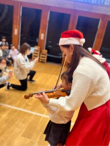 5歳児さんは、バイオリン体験をしました。初めて触るバイオリンにドキドキしていた子どもたち。音が鳴ると