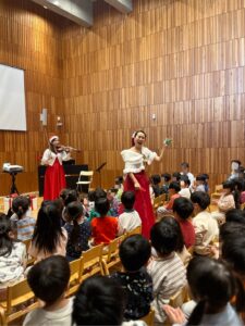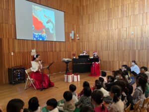 絵本「クリスマス・イブのねがいこと」の読み聞かせに合わせて、ピアノやバイオリンの演奏を聴いたり
