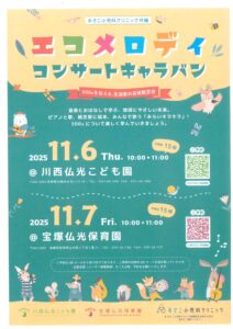 2025.10.15 最新情報 エコメロディコンサートキャラバンのご案内 11月7日(金)おさこ小児科クリニックとのコラボイベントです! エコメロディコンサートキャラバンの予約が可能となりましたのでお知らせいたします。 予約に制限(15組)がございますので、早めのご予約をお願いいたします。 エコメロディコンサートキャラバン